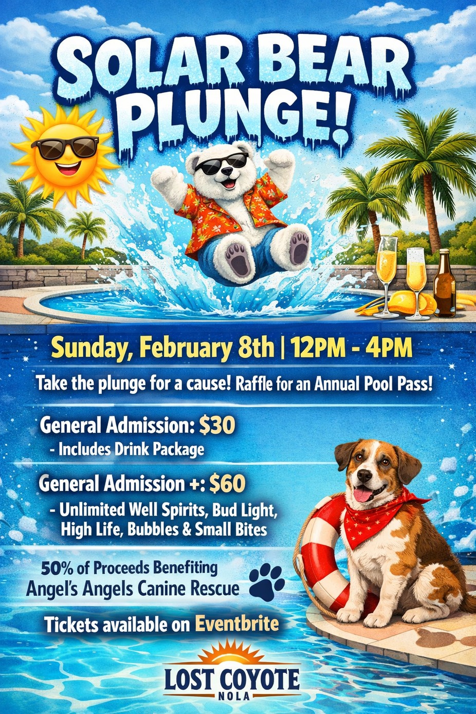 Take the plunge for a paws-itively good cause at Lost Coyote’s Solar Bear Plunge! Join us Sunday, February 8th from 12pm–4pm for an afternoon of poolside fun, frosty drinks, and feel-good giving.